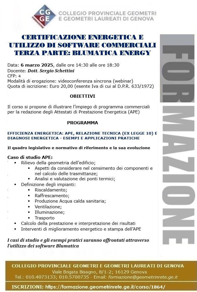 Il corso si propone di illustrare l’impiego di programma commerciali per la redazione degli Attestati di Prestazione Energetica (APE)
