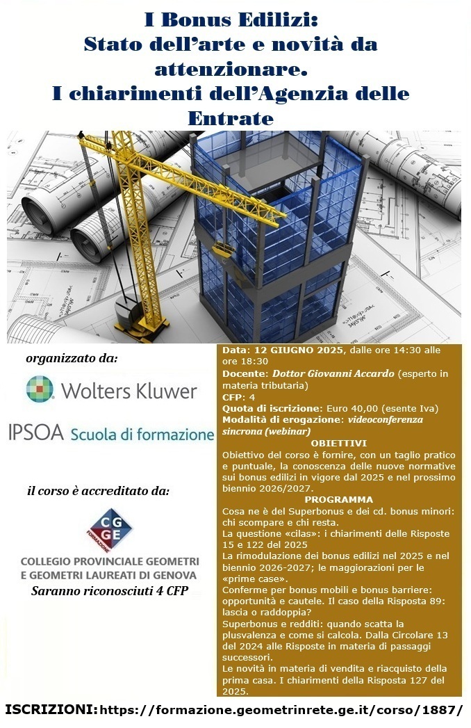 Su questo tema è intervenuta puntualmente la Scuola di formazione IPSOA, organizzando un corso focalizzato sui recenti chiarimenti che l’Agenzia delle Entrate ha fornito in tema di nuove normative sui Bonus Edilizi in vigore dal 2025 e nel prossimo biennio 2026/2027